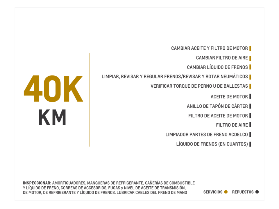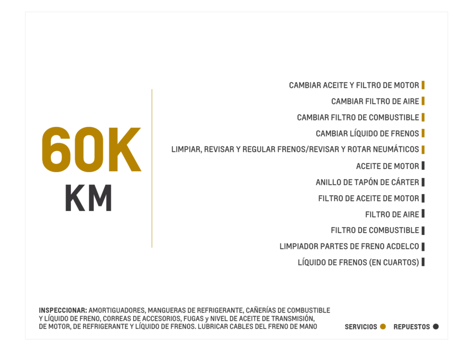 *Las rutinas de mantenimiento expuestas hacen parte de los procesos mandatorios establecidos por la marca. Existen otros procedimientos de rutina de mantenimiento adicionales denominados consultivos, que pueden llegar a prestarse en la red de concesionarios Chevrolet autorizados a nivel nacional.