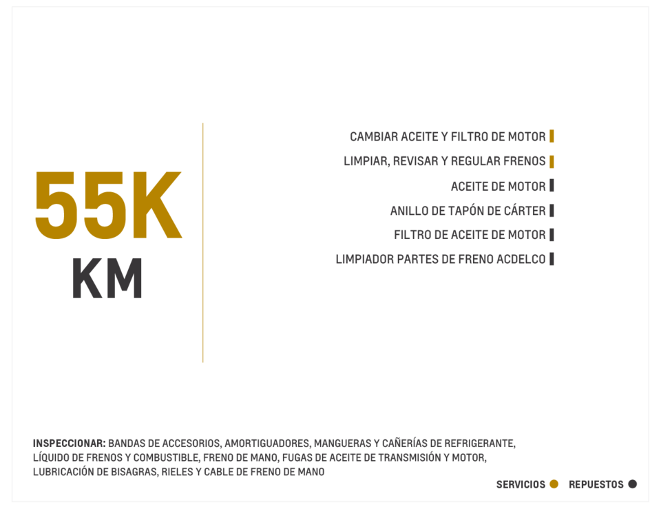 *Las rutinas de mantenimiento expuestas hacen parte de los procesos mandatorios establecidos por la marca. Existen otros procedimientos de rutina de mantenimiento adicionales denominados consultivos, que pueden llegar a prestarse en la red de concesionarios Chevrolet autorizados a nivel nacional.