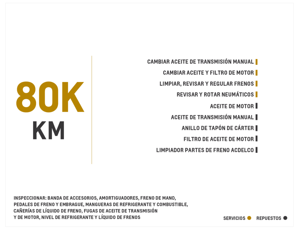 *Las rutinas de mantenimiento expuestas hacen parte de los procesos mandatorios establecidos por la marca. Existen otros procedimientos de rutina de mantenimiento adicionales denominados consultivos, que pueden llegar a prestarse en la red de concesionarios Chevrolet autorizados a nivel nacional.