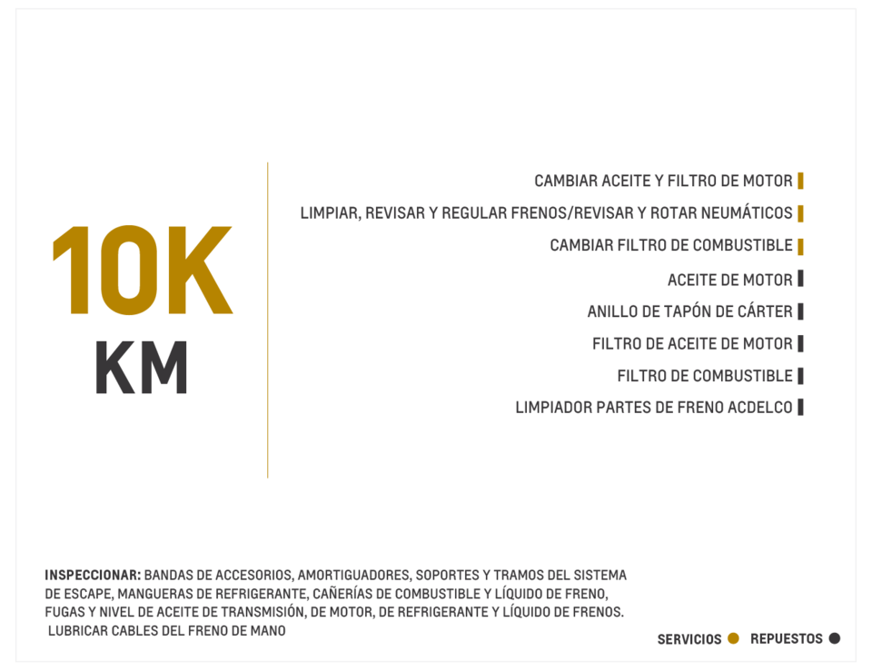 *Las rutinas de mantenimiento expuestas hacen parte de los procesos mandatorios establecidos por la marca. Existen otros procedimientos de rutina de mantenimiento adicionales denominados consultivos, que pueden llegar a prestarse en la red de concesionarios Chevrolet autorizados a nivel nacional.
