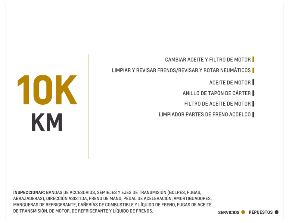 *Las rutinas de mantenimiento expuestas hacen parte de los procesos mandatorios establecidos por la marca. Existen otros procedimientos de rutina de mantenimiento adicionales denominados consultivos, que pueden llegar a prestarse en la red de concesionarios Chevrolet autorizados a nivel nacional.